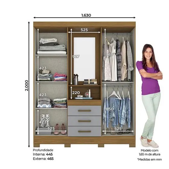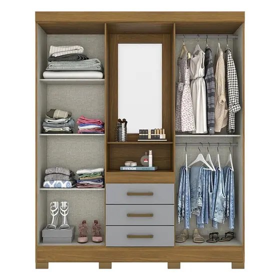 Com 4 portas, oferece amplo espaço interno para acomodar roupas maiores em cabideiros, além de prateleiras para roupas dobradas. As 3 gavetas espaçosas complementam a organização, ideais para peças menores e acessórios.