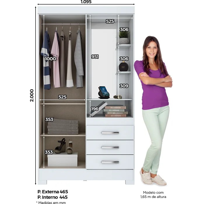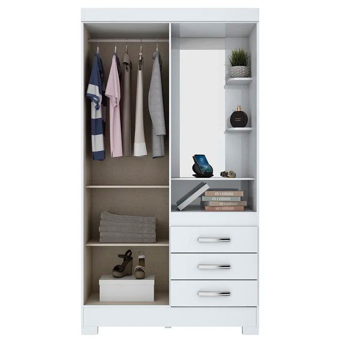 Com 2 portas e 3 gavetas internas, oferece amplo espaço para armazenar roupas, calçados e acessórios. Internamente, conta com prateleiras e cabideiros bem distribuídos, garantindo funcionalidade e facilidade na organização diária.