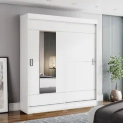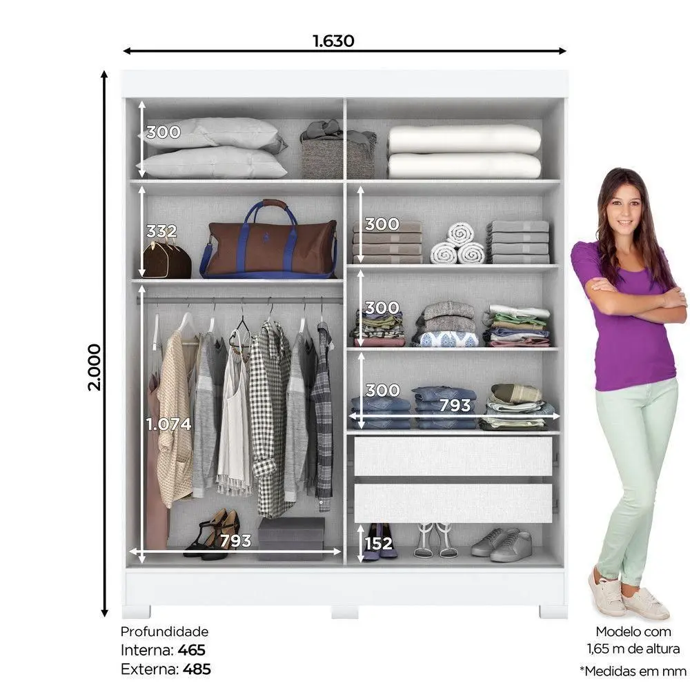 Equipado com 2 portas deslizantes, proporciona abertura suave sem ocupar espaço adicional, sendo perfeito para ambientes compactos. Internamente, conta com prateleiras e cabideiros bem distribuídos, garantindo organização eficiente para roupas, acessórios e calçados.