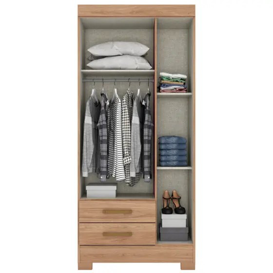 Com 3 portas e 2 gavetas internas, oferece amplo espaço para organizar roupas, calçados e acessórios. Seus pés elevados proporcionam maior facilidade na limpeza do ambiente e adicionam um toque moderno ao design do móvel. Internamente, conta com prateleiras e cabideiros bem distribuídos, garantindo funcionalidade e praticidade.
