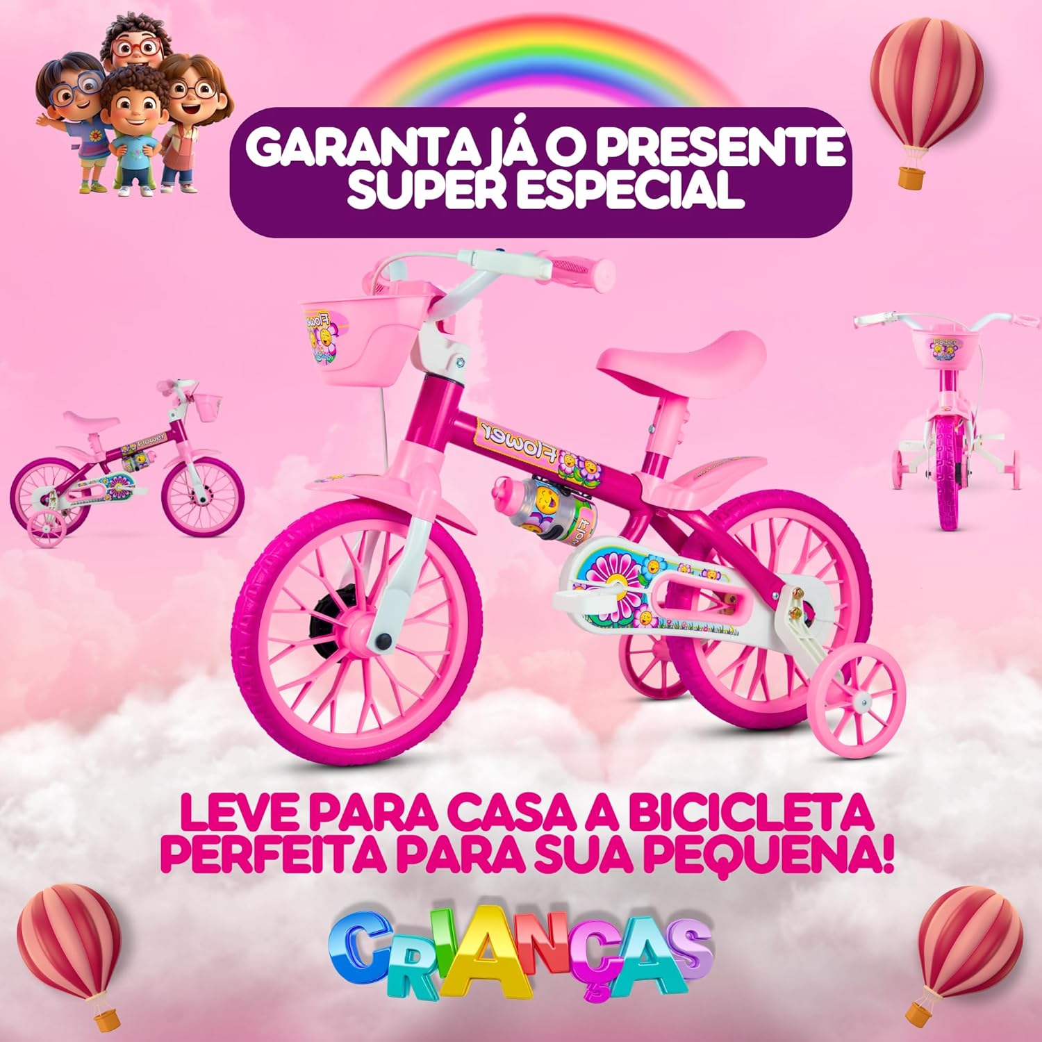 Bicicleta Infantil Aro 12 Feminina Flower Rosa/Branco Lilly
