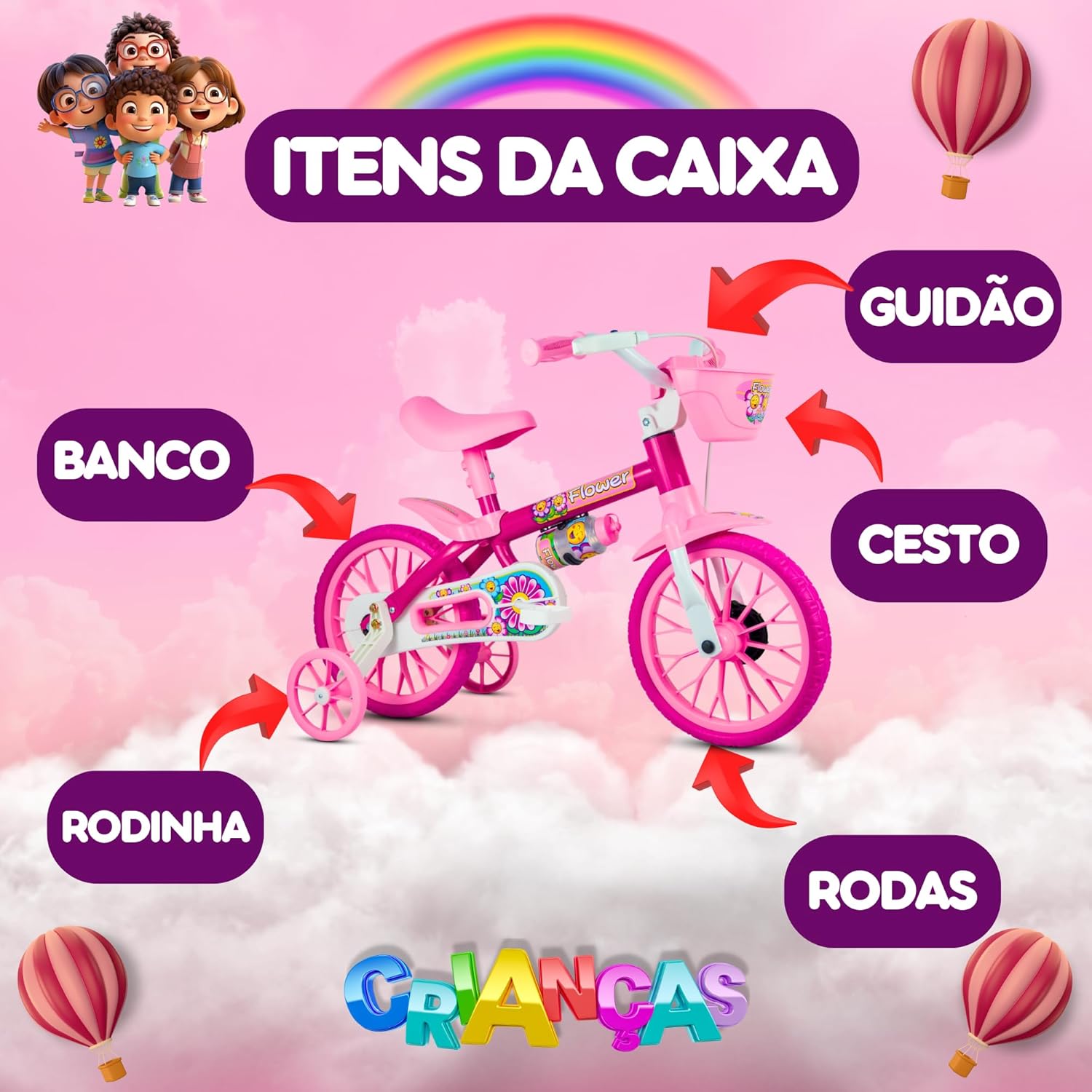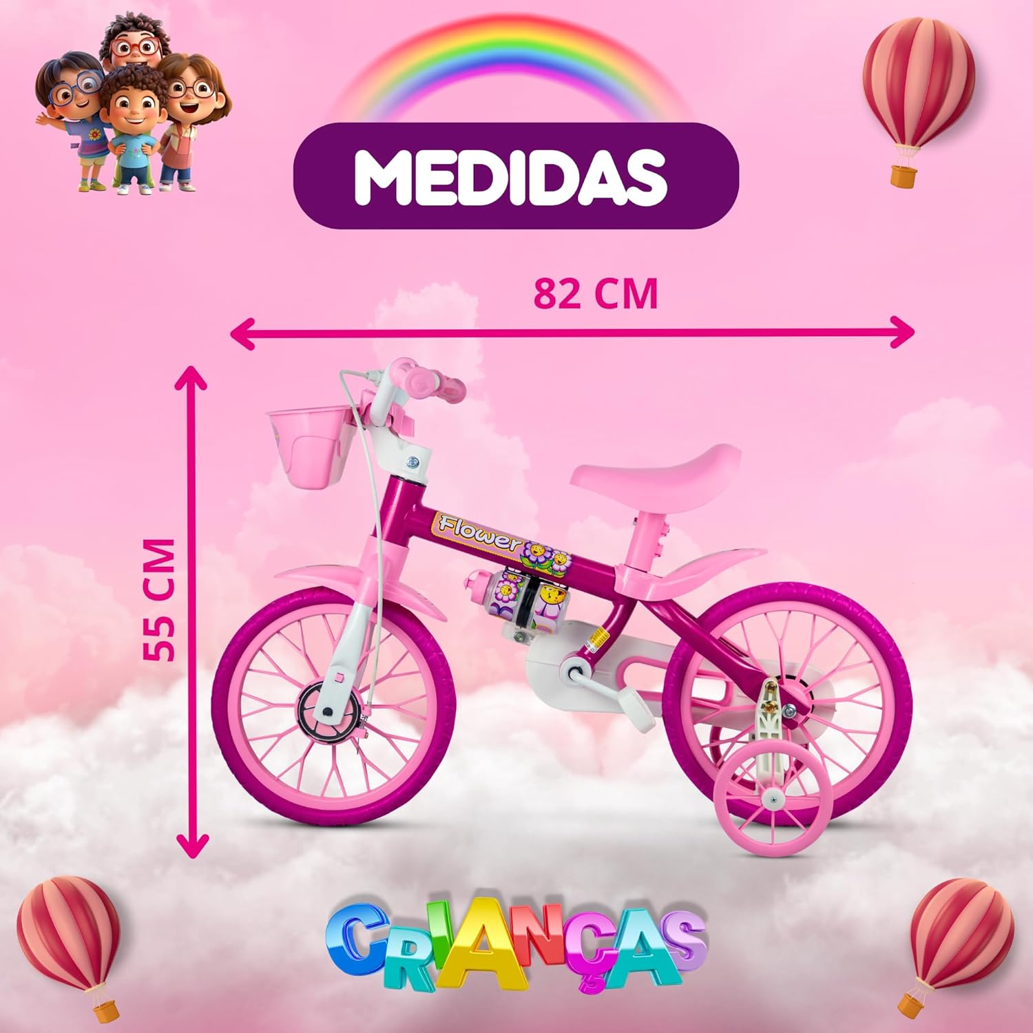 A Bicicleta Cairu Flower Lilly Aro 12 foi desenvolvida para meninas de cerca de 3 anos, com altura entre 90 cm e 1 m. Design delicado em rosa e branco com detalhes florais, ela alia segurança, beleza e conforto nas primeiras pedaladas: