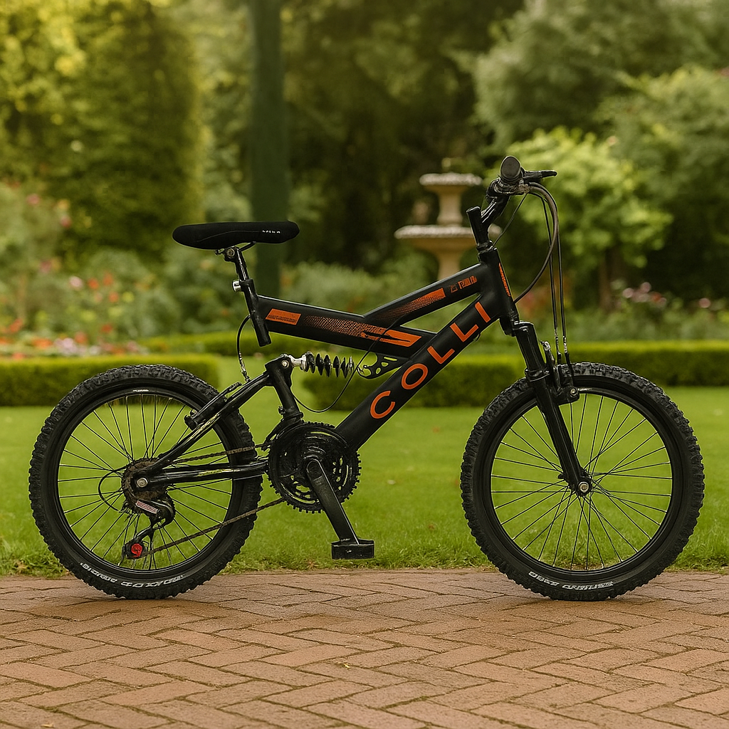 A Colli GPS Full Aro 20 combina conforto, desempenho e estilo para jovens que buscam uma bike resistente e moderna. Equipada com 21 marchas e dupla suspensão, oferece uma pedalada suave em diferentes tipos de terreno, enquanto o design esportivo em preto fosco com detalhes laranja neon garante um visual marcante.