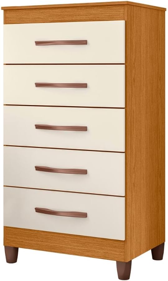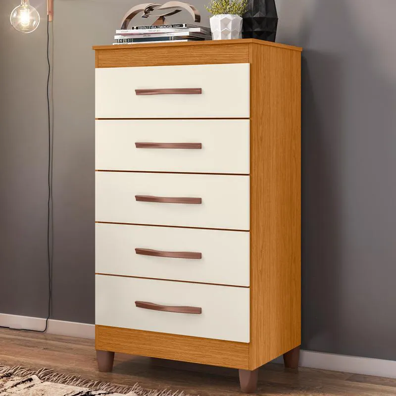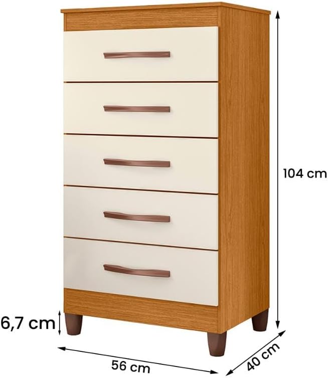 A Cômoda Esmeralda é ideal para quem busca organização, praticidade e um visual moderno. Com acabamento em Cinamomo combinado com Off White, ela traz elegância e aconchego ao ambiente, sendo fácil de harmonizar com diferentes estilos de quarto. Oferece ótimo espaço interno para guardar roupas, acessórios e objetos do dia a dia.