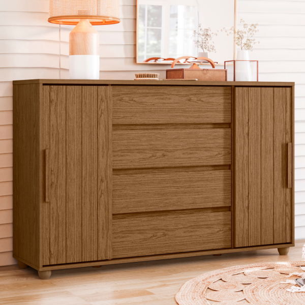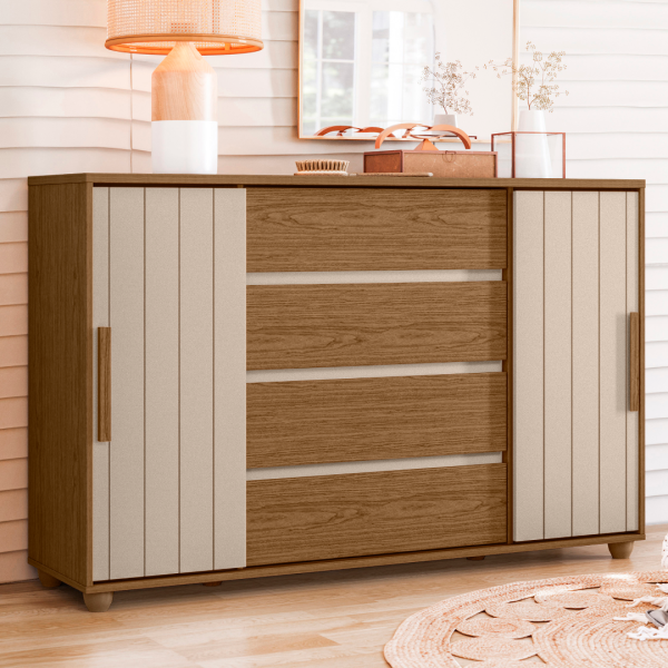 A Cômoda Evidenza Flex combina elegância e praticidade, oferecendo amplo espaço para armazenar roupas, acessórios e objetos pessoais. Produzida em MDP de alta resistência, possui acabamento externo Jatobá com detalhes em Fendi Metallic, trazendo um visual moderno, sofisticado e ideal para complementar qualquer ambiente.