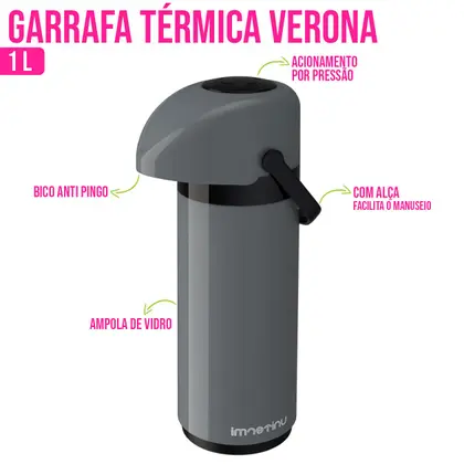 A Garrafa Térmica Verona 1 Litro Cinza é ideal para quem busca elegância, praticidade e eficiência na conservação de bebidas. Com design moderno e acabamento sofisticado, ela mantém o seu café, chá ou suco na temperatura ideal por muito mais tempo.