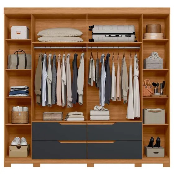 Amplo espaço interno, organizado com gavetas, prateleiras e cabideiros