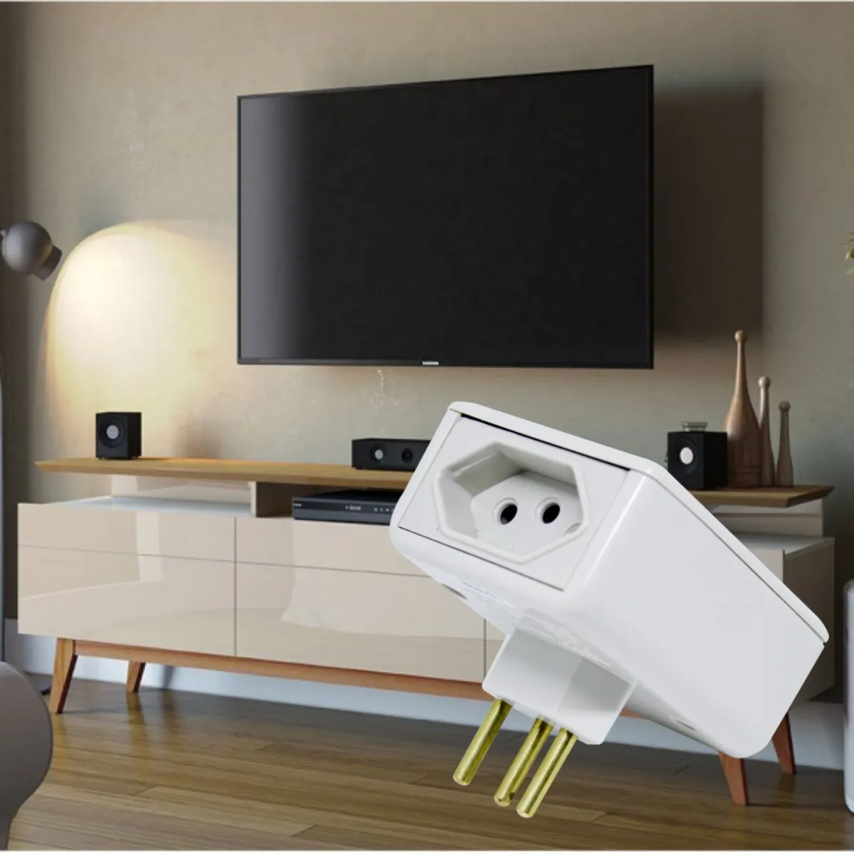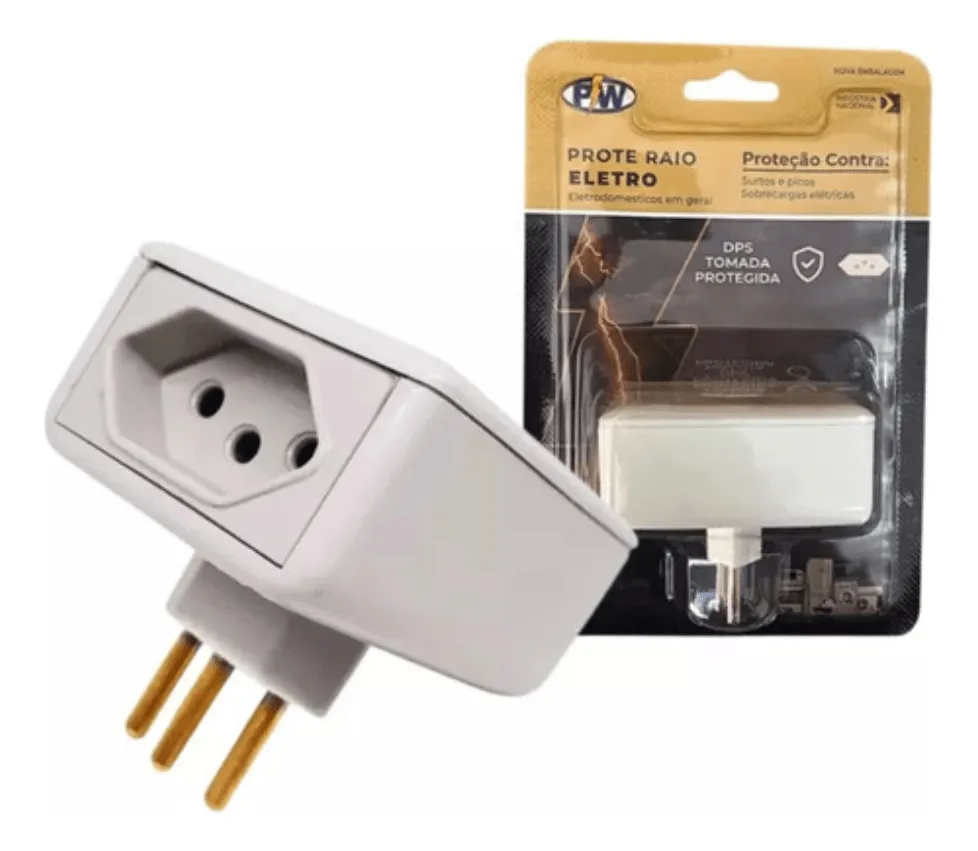 Pino protetor contra surtos elétricos 2P+T, 10A, modelo bipolar, com 2 tomadas na cor branca. Ideal para proteção básica de equipamentos eletrônicos contra picos de tensão, oferecendo praticidade e segurança no uso diário.