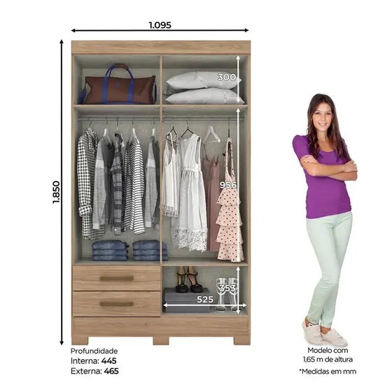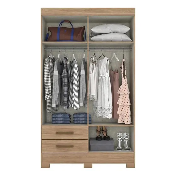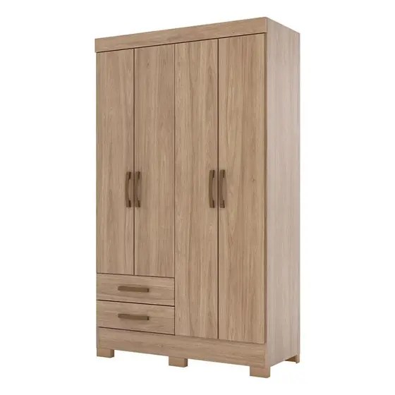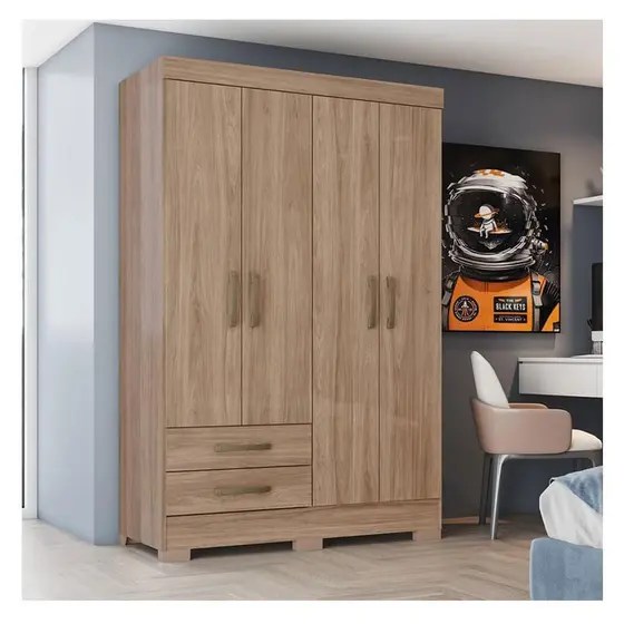 Com 4 portas e 2 gavetas internas, oferece espaço suficiente para armazenar roupas, calçados e acessórios de forma prática. Internamente, conta com prateleiras e cabideiros bem distribuídos, garantindo facilidade de organização. Os pés elevados facilitam a limpeza e conferem um toque moderno ao design.