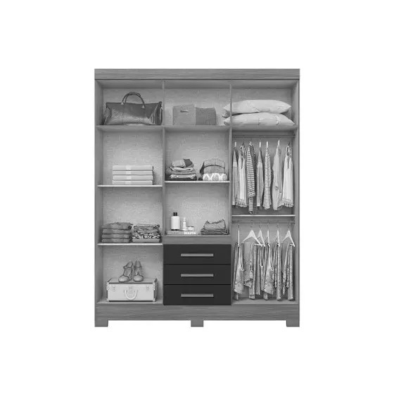Com 6 portas e 3 gavetas internas, oferece excelente aproveitamento interno, permitindo armazenar roupas, calçados e acessórios de forma prática e funcional. Internamente, conta com prateleiras e cabideiros bem distribuídos, garantindo organização eficiente.