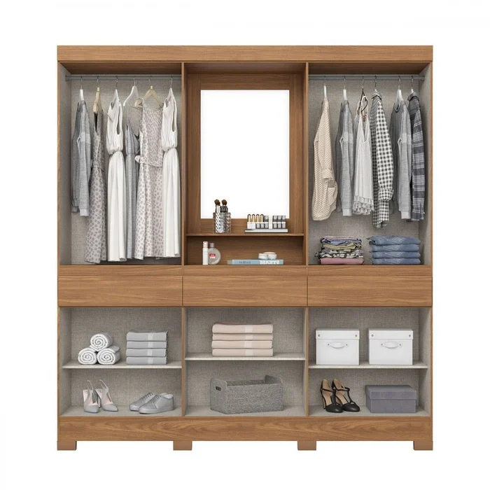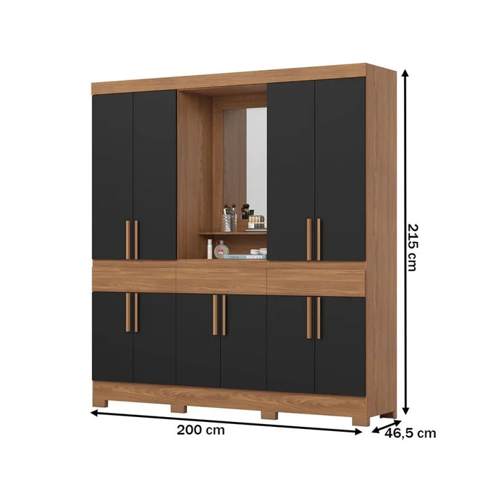 Espelho integrado: um dos painéis (ou porta) tem espelho com moldura. Medidas do espelho: aproximadamente 73,0 cm de altura × 52,4 cm de largura × 3 mm de espessuraOutras partes: