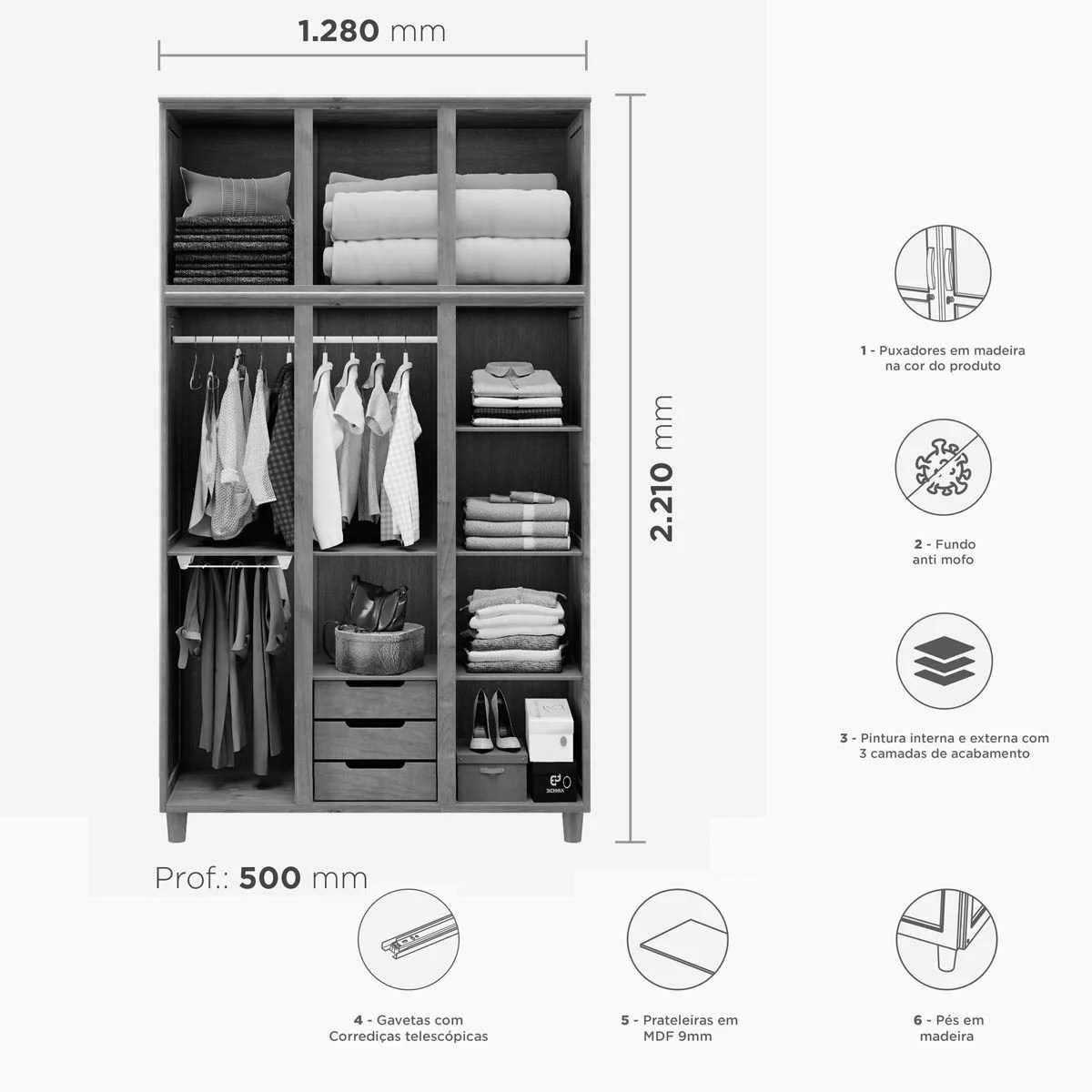 Com 3 portas amplas, proporciona fácil acesso ao interior, que conta com prateleiras, cabideiros e gavetas bem distribuídas, permitindo organizar roupas, calçados e acessórios de forma prática e eficiente. Sua estrutura robusta garante durabilidade e resistência, ideal para o uso diário.